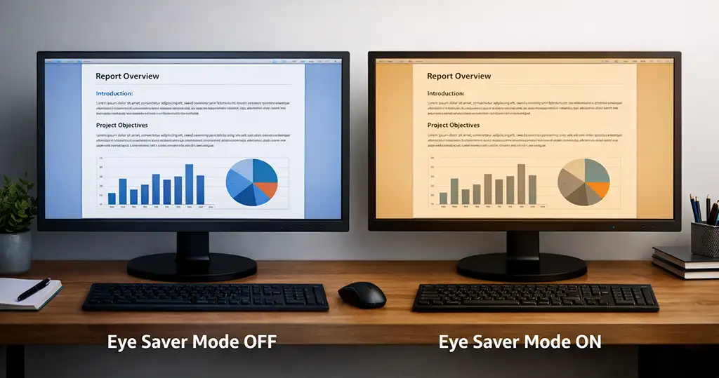 Режим Eye Saver был разработан в первую очередь для повышения комфорта при чтении, работе с документами и длительном использовании экрана. С минимальными усилиями пользователь может переключиться на настройки, которые воспринимаются глазами мягче и естественнее.
