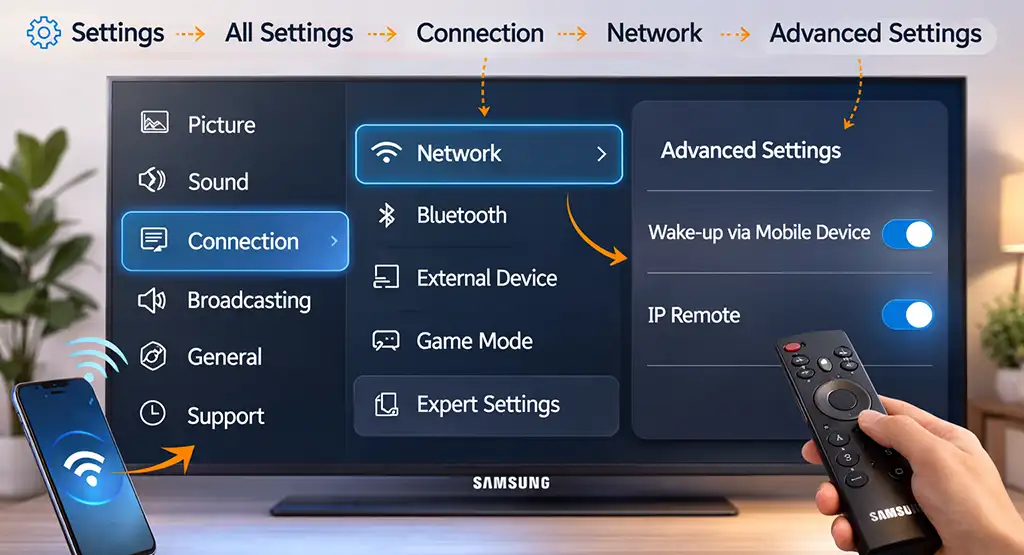 Los televisores Samsung modernos no tienen configuraciones separadas de WOL o WOW. En su lugar, usan la función «Wake via Mobile Device» (activar mediante dispositivo móvil), que permite que dispositivos móviles de terceros enciendan el televisor, y «IP Remote», que permite el control a través de Internet. Ambas funciones deben estar activadas.